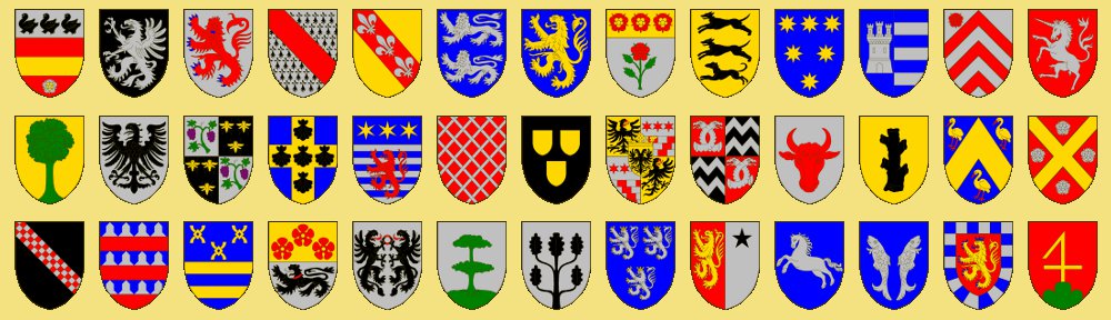 Vorgestern hat zum ersten Mal, mich jemand danach gefragt, wo die Wappen aus meinem Header herkommen und zwar Marc Burggraff. Die Frage selber konnte ich rasch beantworten! Es sind 3 x 13 =39 Wappen aus meiner Wappendatenbank, die ich nach dem Zufallsprinzip ausgewählt habe. Übrigens: auf der Seite http://www.wiesel.lu/about, wo ich eine kurze Zusammenfassung meiner Website versucht habe, läuft so ein Skript das einem immer 6 zufällig ausgewählte Wappen dieses Auftrittes anbietet. Ich hatte nur mal kurz das Skript auf “39” gestellt und liess WordPress mal machen. Die angezeigten Wappen lud ich in GIMP, verkleinerte sie und platzierte sie in ein Gitter. Letzteres habe ich dann vorher entfernt und dem ganzen noch eine Hintergrundfarbe spendiert.