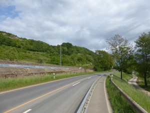 Während zwei Wochen vor der Schliessung der Strasse, war der Radweg vom Moseltal (auf dem Bild links zu sehen) neben die Strasse verlegt worden, damit die LKW den Radweg zum An- und Abtransport von Baumaterialien alleine nutzen konnten.