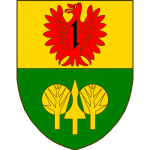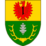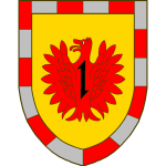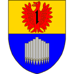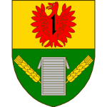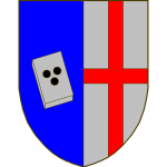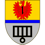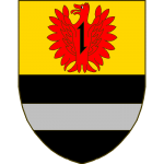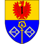 in Gold ein rotes Fabeltier mit einem Wolfskopf und weit geöffneten Schwingen, belegt mit einem schwarzen Wolfshaken.