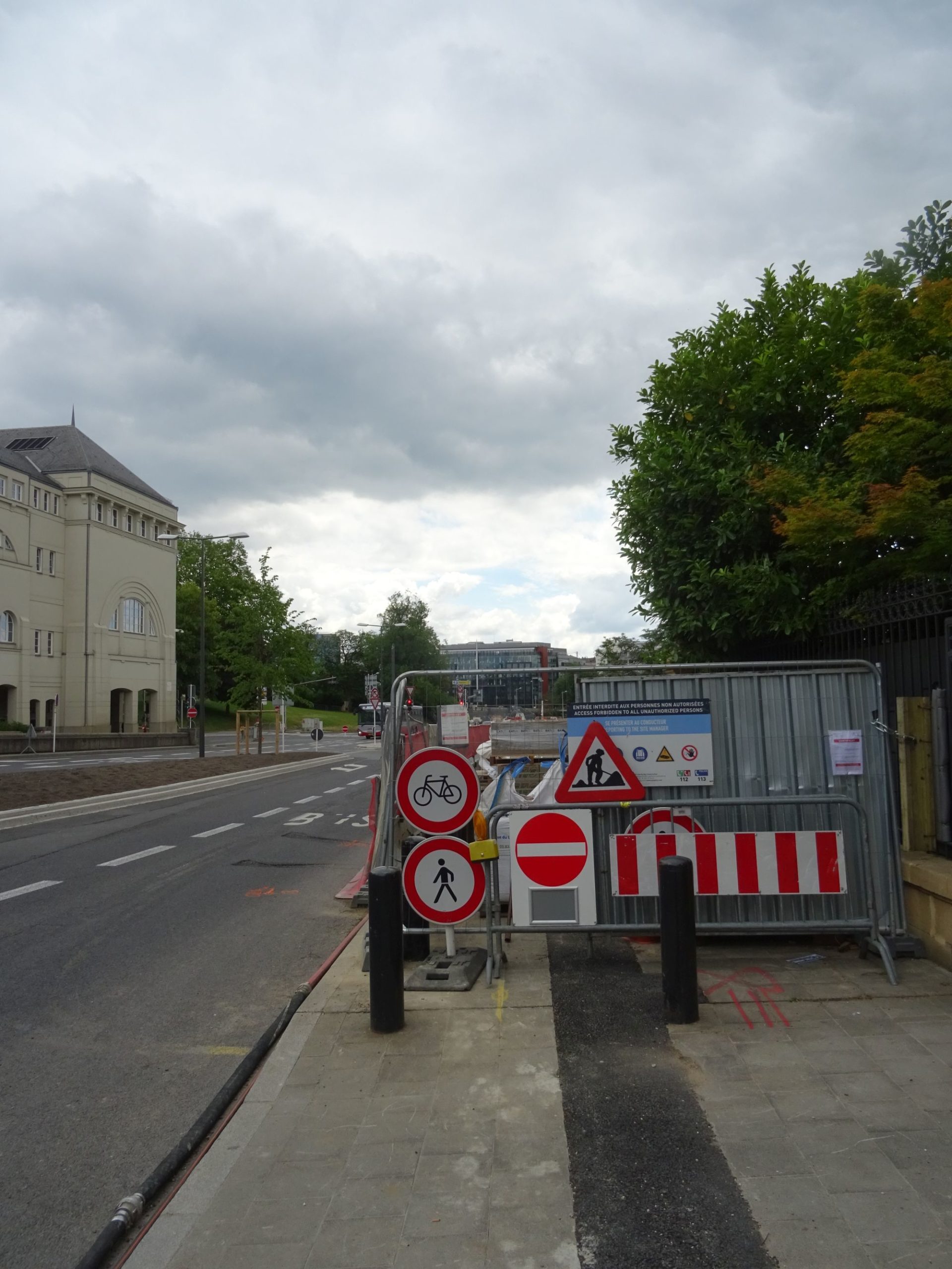 Hier hat der Bauunternehmer alles an Schildern aufgeboten, das ihm irgendwie passend schien, damit niemand über die ohnehin versperrte Velospiste fährt oder geht. Wiedersprüchlich ist das “Einbahn”-Schild, der weisse Querbalken auf rotem Grund, der ja eigentlich bedeutet, “Du darfst hjer nicht reinfahren, denn aus der Gegenrichtung können aber Fahrzeuge kommen” was ja aber gerade nicht der Fall ist.
