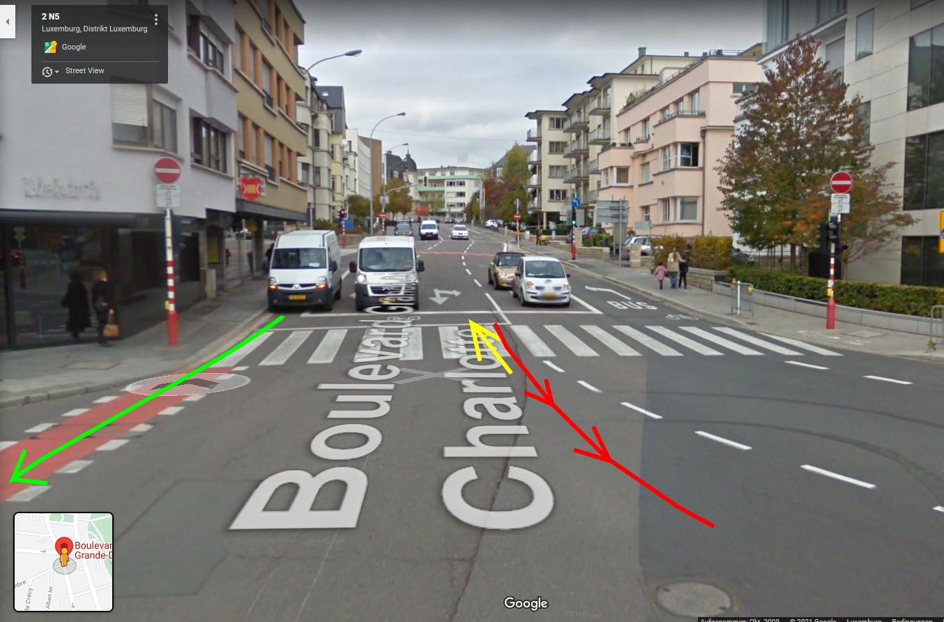 Mein Fahrraderlebnis heute: Ich fahre auf die rote Ampel auf der Avenue Grand-Duchesse Charlotte an der Kreuzung mit der Avenue Monterey zu. Dort gibt es vier Kraftfahrspuren, drei davon in Richtung “ale Foyer” und einen schmalen Radstreifen rechts. Den nutze ich aber so gut wie immer nur, um den Fahrradaufstellstreifen vor der Ampel zu erreichen. […]