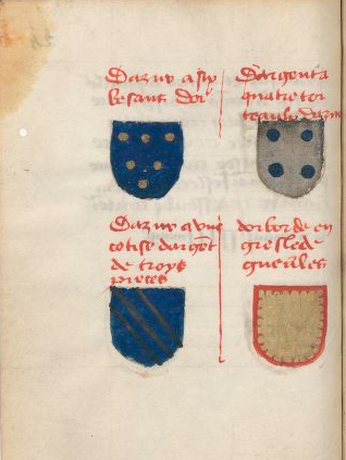Prinsault, page 60 Sizes: 150 × 150 / 226 × 300 / 318 × 423 Prinsault, page 60 d’asur à VI besans d’or. d’argent à IIII torteaux d’asur. d’asur à un cotice d’argent de III pièces. d’argent bordé engrellé de gueules.