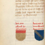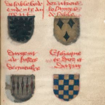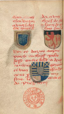 Prinsault, page 72: d’or à un escu d’asur et et (-sic-) un filet de gueules. -- d’or à ung chef de sable un lyon de gueules yssant. -- d’or et d’asur au pied party au chef palé fessé contrefessé à II cantons gironnez et un escu d’argent parmy. Sont les armes de Présigny.