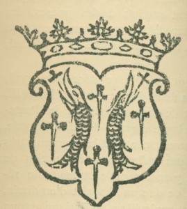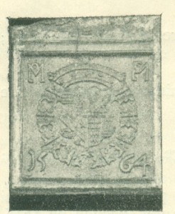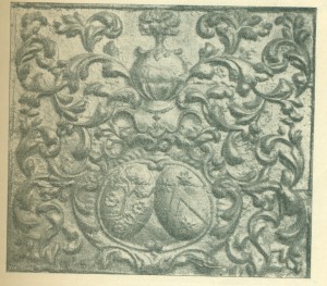 - ED:La plus ancienne plaque de ce genre m’est signalée par M. le Dr Coliez, père. D’après son inscription elle a appartenu à François de Poupigny, commissaire de l’artillerie en 1554. Ses armoiries y sont deux fois reproduites; l’écusson est tenu par deux artilleurs et est à la fasce accompagnée de trois canettes, 1-2. Dans la partie de la plaque on voit les armes de France, entourées du collier de St.-Michel et accostées de deux grenades. [↩]