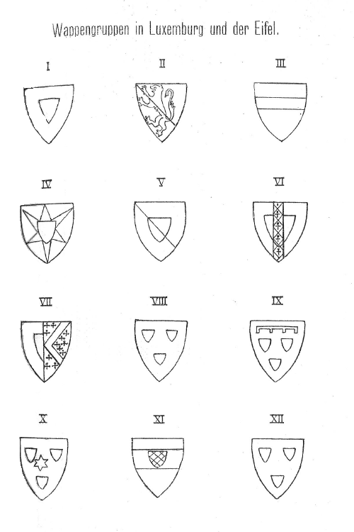 Trotz der großen Anzahl adliger Familien in Luxemburg und der Eifel im Mittelalter ist die Zahl der Wappen doch verhältnismäßig beschränkt, da viele Familien dasselbe Wappen führen 1. Einesteils haben einige dieser Familien denselben Ursprung und ist deshalb bei den Nachkommen das Wappen mit geringen Abweichungen (Turnierkragen, veränderten Farben, Zufügung von Beizeichen, Sternen, Lilien, Hermelin etc.) dasselbe geblieben, andernteils haben die Ministerialen, Vasallen oder Beamten dieser Familien häufig das Wappen ihrer Herren ganz oder mit kleinen Änderungen angenommen. 2 Bei einer Anzahl von Familien, wo weder eine Verwandtschaft noch ein Vasallen- oder Dienstverhältnis nachzuweisen ist, mag aber auch das gemeinsame Wappen als ein Zeichen desselben Stammes, derselben Sippe, im weitern Sinne aufzufassen sein. 3 Schließlich kann auch eine gewisse Vorliebe für ein oder das andere Wappenzeichen, welches auf dem Schild oder der Fahne eines besonders angesehenen Geschlechts angebracht war, andere Familien bestimmt haben, dasselbe oder ein ähnliches Wappen aufzunehmen. 4 Bei der Forschung nach den Ursachen, welche der Führung eines gemeinsamen Wappens bei den verschiedenen Familien zu Grunde liegen, wirkt der Umstand häufig erschwerend, dass dieselbe Familie nicht ihr Stammwappen weiter führt, sondern dass der Mann zuweilen das Wappen seiner Frau, welche ihm eine Herrschaft oder Burg zugebracht, annimmt, oder dass er und seine Nachkommen den Familiennamen fallen lassen und den Namen der zugebrachten Herrschaft weiter führen; hierdurch werden leicht Verwechslungen und falsche Zuteilungen entstehen.
