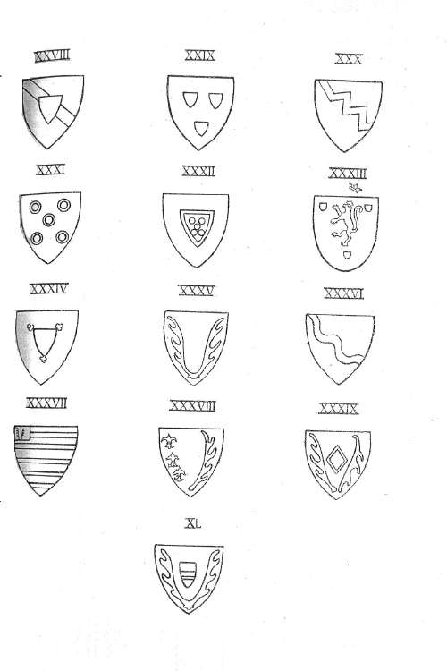 Die v. Vlissheim führen gewöhnlich 5 silb. Ringe 2, 1, 2, im roten Feld (siehe Wappen XXXI); Hermann hat aber das Nattenheimer Wappen silb. Schildchen im schwarzen Feld und in ersterem wieder ein schwarzes Schildchen mit 5 goldenen Kugeln 2, 1, 2 (siehe Wappen XXXII). - Die Lissingen gen. Gegen siegeln mit 3 Schildchen im Wappen 2, 1, rot in silb. Felde, als Helmzier 2 rote Flügel, über; dem Schildchen zuweilen ein 3lätz. Turnierkragen, so siegelt 89Johann Lissingen, der 1478 von Trier mit dem Hof zu «Burne uff der Suren» belehnt wurde; 1363 trug Diedrich v. L. Lehen von MaIberg zu Messerich, woraus sich vielleicht das Wappen erklärt. Katharine v. Lissingen, die dasselbe Wappen aber ohne Turnierkragen führt, brachte 1490 ihrem Gemahl Hermann v. d. Heyden die Burg zu Nieders Gegen an der Geybach bei Echternach zu. 90