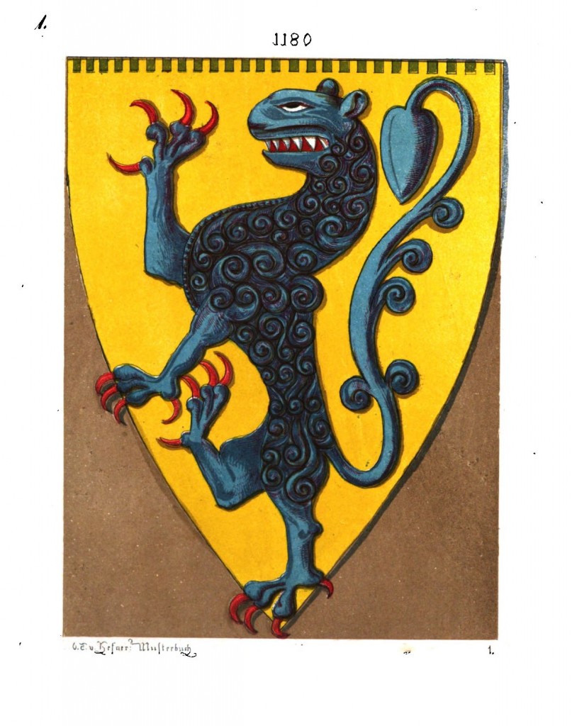 Derselbe ist nach einem Originale im hiesigen Nationalmuseum. Dieses Original ist ein Basrelief aus Sandstein, gegen 3 Fuss hoch und 2 ½, Fuss breit, und stammt aus dem ehemaligen Kloster Steingaden. Das Kloster im bayerischen Oberlande war eine Stiftung der Welfen und es ist daher anzunehmen, dass auf vorliegendem Steine der welfische Löwe solle dargestellt sein. Die Stiftung des Klosters fällt um das Jahr 1154 (Mon. Boica VI. 481 ff.) und obwohl es möglich ist, dass der Wappen-Stein schon um jenes Jahr gefertigt worden sei, so glaube ich doch ebenso gut eine etwas spätere Zeit für die Entstehung annehmen zu dürfen. Keinenfalls wollte ich mit der Jahrzahl 1180 ein diplomatisch-genaues Datum, sondern nur die zweite Hälfte des XII. Jahrhunderts angedeutet haben. Ich halte diesen Löwen für das nahezu älteste, jedenfalls aber best erhaltene und instruktivste Beispiel dieser Wappenfigur. Es kommen wohl auf Siegeln hie und da schon Löwen um die Mitte des XII. Jahrhunderts vor (vergl. mein Handbuch der Heraldik S. 11), allein sie sind alle zu klein, um die Einzelheiten in den Formen daraus entnehmen zu können.