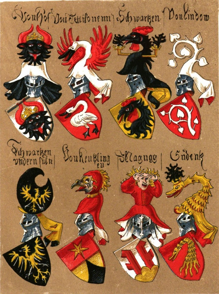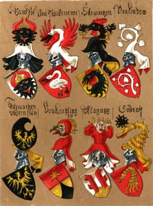 Vollständige Wappen aus den Jahren 1280-1325 aus der Züricher Wappenrolle Sizes: 150 × 150 / 223 × 300 / 620 × 832 / 1200 × 1610 OTvH, Tafel 34: Acht Wappen schwäbischer Adelsgeschlechter aus der Mitte des XVI. Jahrhunderts