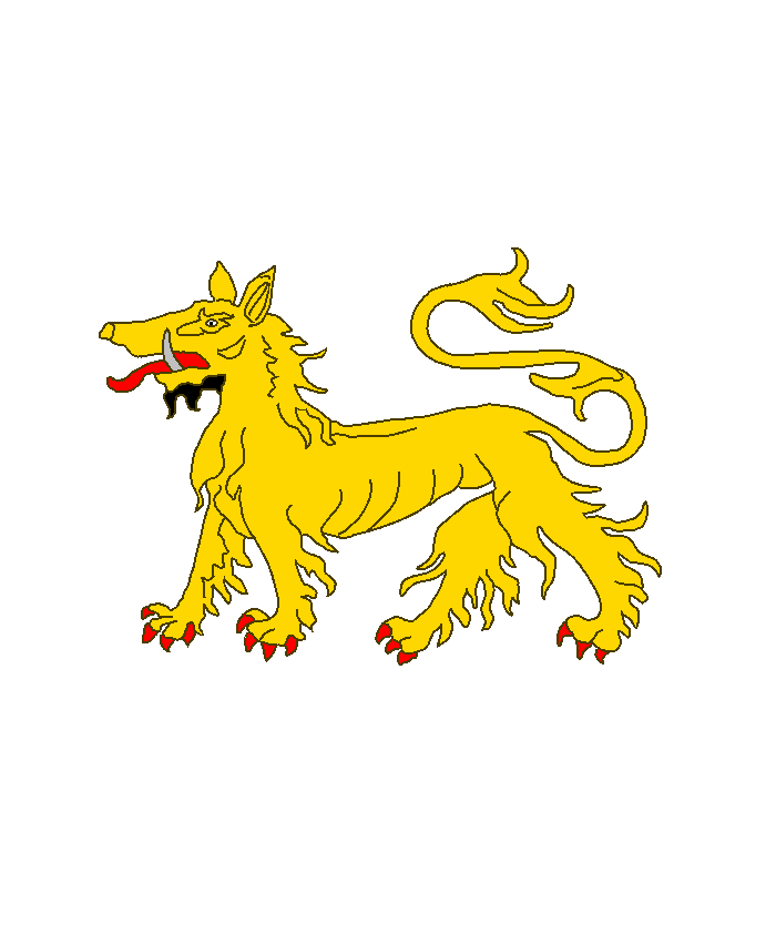 Seine Zeichnung, der ich meine eigene obige nachempfunden habe, zeigt freilich eher einen Wolfskopf, was der Beschreibung im Alphabet et figures de tous les termes du blason von L.-A. Duhoux d’Argicourt — Paris, 1899 näherkommt: