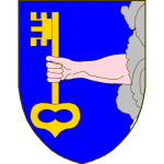 D’azur à un senestrochère de carnation, mouvant d’une nuée d’argent au flanc senestre et tenant une clé d’or, posée en pal, le panneton en haut à dextre.