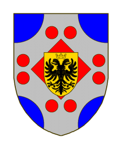 D’argent à un écusson d’or, chargé d’une aigle éployée de sable surmontée d’une couronne d’or, ledit écusson brochant sur une losange de gueules et accompagné de six tourteaux du même émail 2 en chef, 2 en pointe et 1 à chaque flanc, à quatre cantons arrondis d’azur, dans les angles de l’écu.