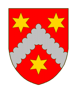 De gueules au chevron cannelé d’argent, accompagné de trois étoiles d’or.