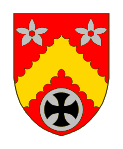 De gueules au chevron engrêlé d’or, accompagné en chef de deux quintefeuilles d’argent et en pointe d’un besant du même, chargé d’une croix pattée et alésée de sable.