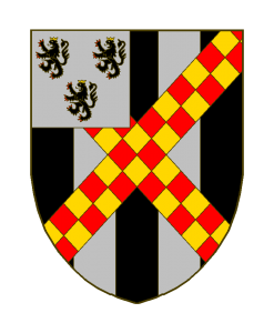 De sable à deux pals d’argent, au sautoir échiqueté d’or et de gueules, brochant sur les pals, et au canton d’argent, brochant sur le tout, chargé de trois lions de sable, armés et lampassés de gueules, couronnés d’or.