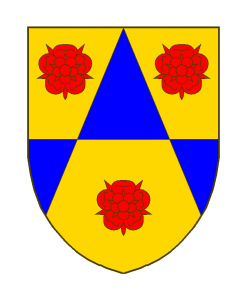 Coupé d’azur sur or, chapé de l’un en l’autre, chacune des trois pièces d’or chargée d’une rose de gueules.