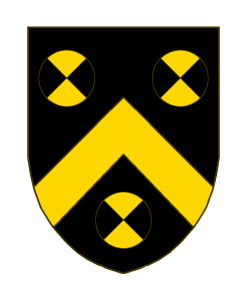 De sable au chevron d’or, accompagné de trois besants-tourteaux, chacun écartelé en sautoir d’or et de sable.