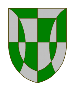 Ecartelé d’argent et de sinople, à la bordure de l’un en l’autre, flanqué en rond encore de l’un en l’autre.