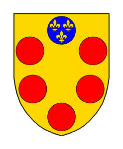 D’or à 5 boules en orle de gueules posées 2 – 2 – 1, une sixième boule en chef d’azur à trois fleurs de lis d’or