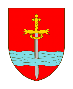 De gueules à une épée d’argent, garnie d’or, posée en pal, la pointe en bas, l’extrémité de la lame perçant une rivière au naturel, poste en fasce près de la base de l’écu.
