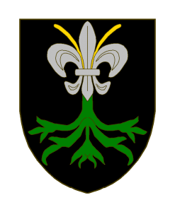 De sable à une fleur-de-lis héraldique d’argent, aux étamines d’or, tigée de sinople et arrachée.