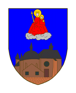 D’azur à la deuxième chapelle du Glacis de Luxembourg au naturel issant en pointe, surmontée de la Vierge Consolatrice’ des Affligés au naturel vêtue de gueules et d’or, posée sur une nuée.