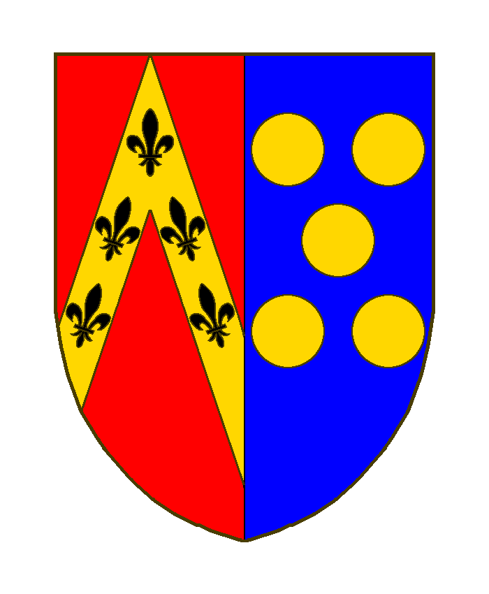 Parti au I de gueules au chevron d’or chargé de cinq fleurs de lis de sable posées dans le sens du chevron, au II d’azur à cinq besants d’or.