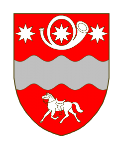 De gueules à la fasce ondée d’argent, surmontée d’un grêlier ou cor de postillon contourné, et de trois étoiles à 8 rais, deux accostant le grêlier, la troisième dans la boucle de l’instrument, accompagnée en pointe d’un cheval courant sellé.