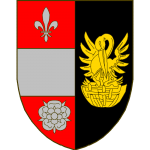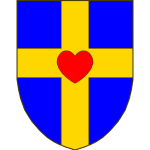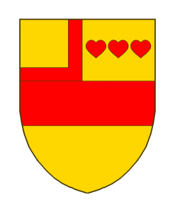 D’or à la fasce de gueules en chef à dextre une escarre du même à senestre de trois coeurs aussi de gueules posés en fasce