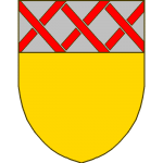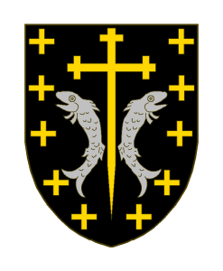 D’or (? plutôt: De sable) à la croix recroisettée au pied fiché d’or accostée de deux poissons adossés d’argent le tout accompagné de croisettes d’or cinq de chaque côté