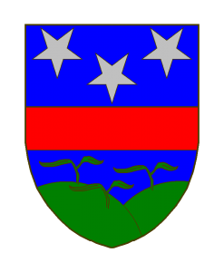 D’azur à la fasce de gueules accompagnée en chef de trois étoiles renversées d’argent, rangées 2 et 1, à la terrasse en chapé–ployé (ou plutôt au mont de deux coupeaux) de sinople, planté du même.