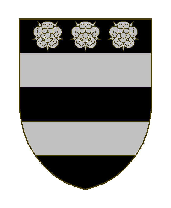 De sable à deux fasces d’argent accompagnées en chef de trois roses du même