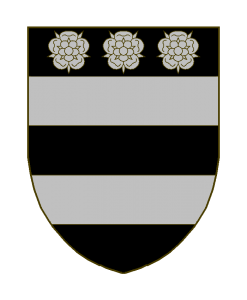 De sable à deux fasces d’argent accompagnées en chef de trois roses du même