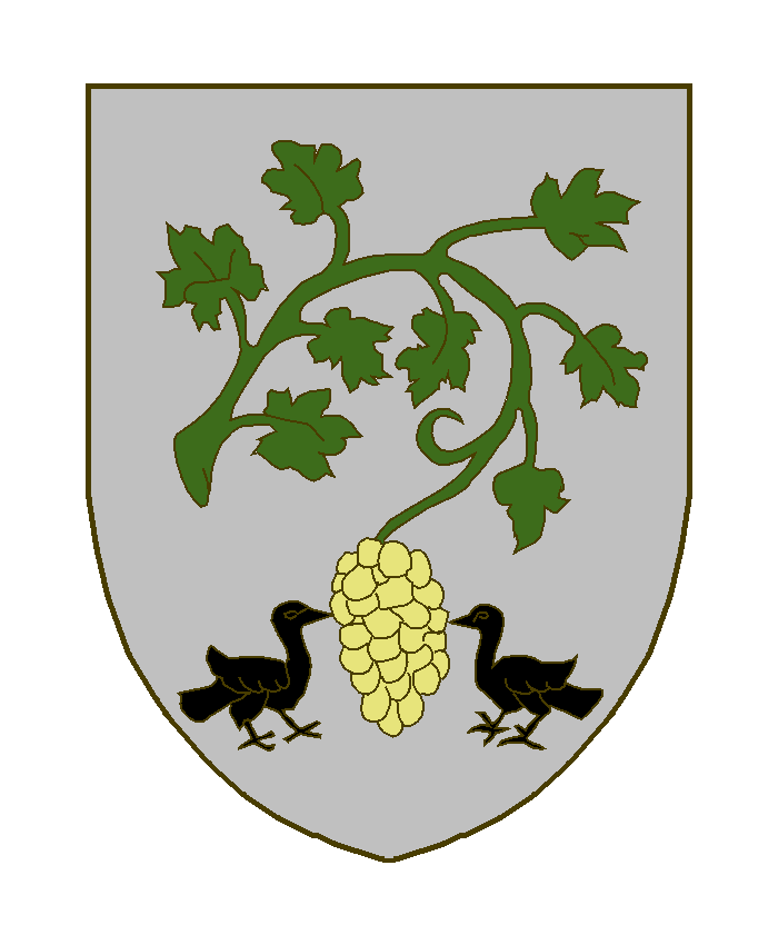 D’argent à une grappe de raisin, tigée et feuillée, au naturel, accompagnée en pointe de deux corbeaux (?) affrontés de sable, becquant la grappe.