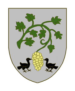 D’argent à une grappe de raisin, tigée et feuillée, au naturel, accompagnée en pointe de deux corbeaux (?) affrontés de sable, becquant la grappe.