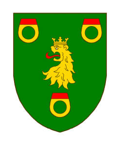 De sinople à une tête de lion couronnée d’or, lampassée de gueules, et accompagnée de trois bagues d’or, châtonnées de gueules.