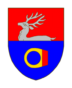 Coupé de gueules au cerf issant d’argent, et d’azur à une bague d’or, châtonnée de gueules à sénestre.