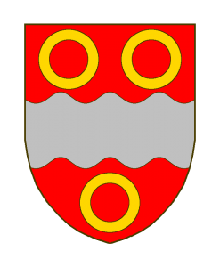 De gueules à la fasce ondée d’argent accompagnée de trois annelets d’or deux en chef un en pointe