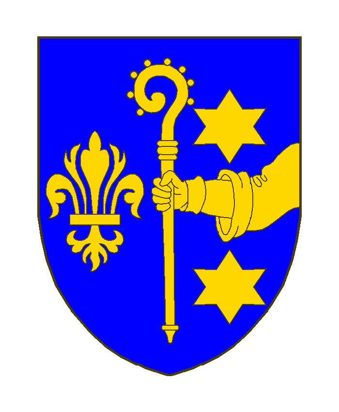 D’azur à un dextrochère mouvant du flanc senestre et tenant une crosse abbatiale, le crosseron tourné à dextre, ladite crosse adextrée d’une fleur de lis épanouie et senestrée de deux etoiles à six rais, le tout d’or.