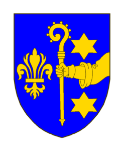D’azur à un dextrochère mouvant du flanc senestre et tenant une crosse abbatiale, le crosseron tourné à dextre, ladite crosse adextrée d’une fleur de lis épanouie et senestrée de deux etoiles à six rais, le tout d’or.