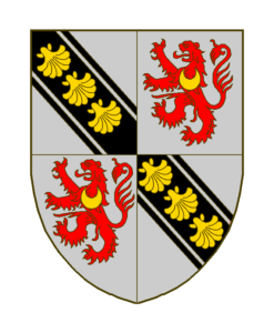 Écartelé: aux 1 et 4, d’argent à la bande coticée de sable chargé de trois coquilles d’or; aux 2 et 3, d’argent au lion de gueules, armé et lampassé du même, chargé en coeur d’un croissant montant d’or.