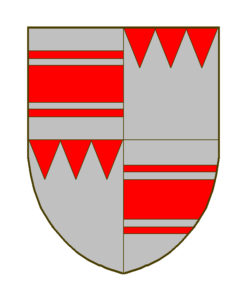 Ecartelé, aux 1 et 4 d’argent à la fasce de gueules entre deux burelés du même, aux 2 et 3 d’argent au chef emanché de gueules de trois pieces.