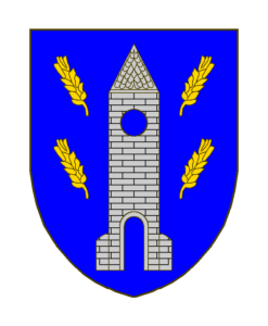 [D’azur à une tour ouverte à toit conique d’argent, accostée de quatre épis d’or, rangés en pal 2 et 2, ceux à dextre posés en bande, ceux à senestre posés en barre.]