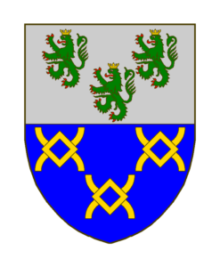 Coupé, en chef d’argent à trois lions de sinople, armés et lampassés de gueules, couronnés d’or, en pointe d’azur à quatre fers de moulin d’or rangés 3 et 1.