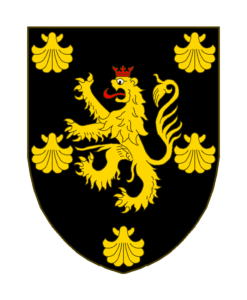 [De sable au lion d’or, lampassé et couronné de gueules, accompagné de cinq coquilles du second, une à chaque coin du chef, une à chaque flanc et une en pointe.]