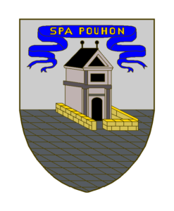 Sur écu d’argent, la niche du Pouhon, tournée vers la droite, maçonnée au naturel sur un carrelage de même, avec une banderôle d’azur posée au-dessus en exergue, et portant les mots: « Spa. Pouhond. » en lettres d’or.