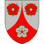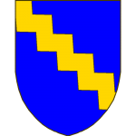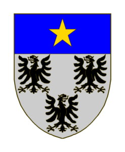 D’argent à trois aigles de sable, celle de la pointe contournée, au chef d’azur chargé d’une étoile a cinq rais d’or. L’écu sommé d’une couronne à neuf perles posées sur le cercle et supporté par deux léopards lionnés.