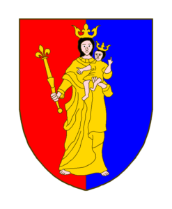 Brochant sur un parti cousu de gueules et d’azur, la Sainte Vierge avec l’enfant Jésus, de carnation, vêtus d’or et ceints d’une couronne ä trois fleurons du même, la Vierge tenant à senestre un sceptre fleurdelisé aussi d’or.