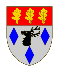 D’argent à une tête-et-col de cerf de sable accostée et soutenue de trois losanges d’azur, au chef de gueules à trois feuilles de chêne d’or posées en pal et rangées.