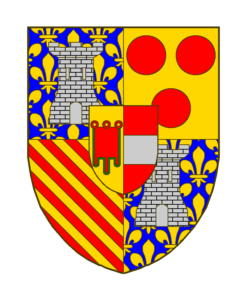 Ecartelé: Aux 1 et 4 d’azur semé de fleurs de lis d’or, à une tour d’argent maçonnée de sable brochant; au 2 d’or à trois tourteau de gueules; au 3 coticé d’or et de gueules- Sur le tout, parti d’or à un gonfanon de gueules frangé de sinople et de gueules à la fasce d’argent.