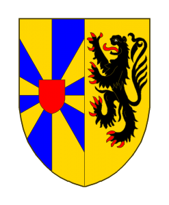 Parti, en 1 gironné d’azur et d’or de 12 pièces; en 2 d’or au lion de sable armé et lampassé de gueules.